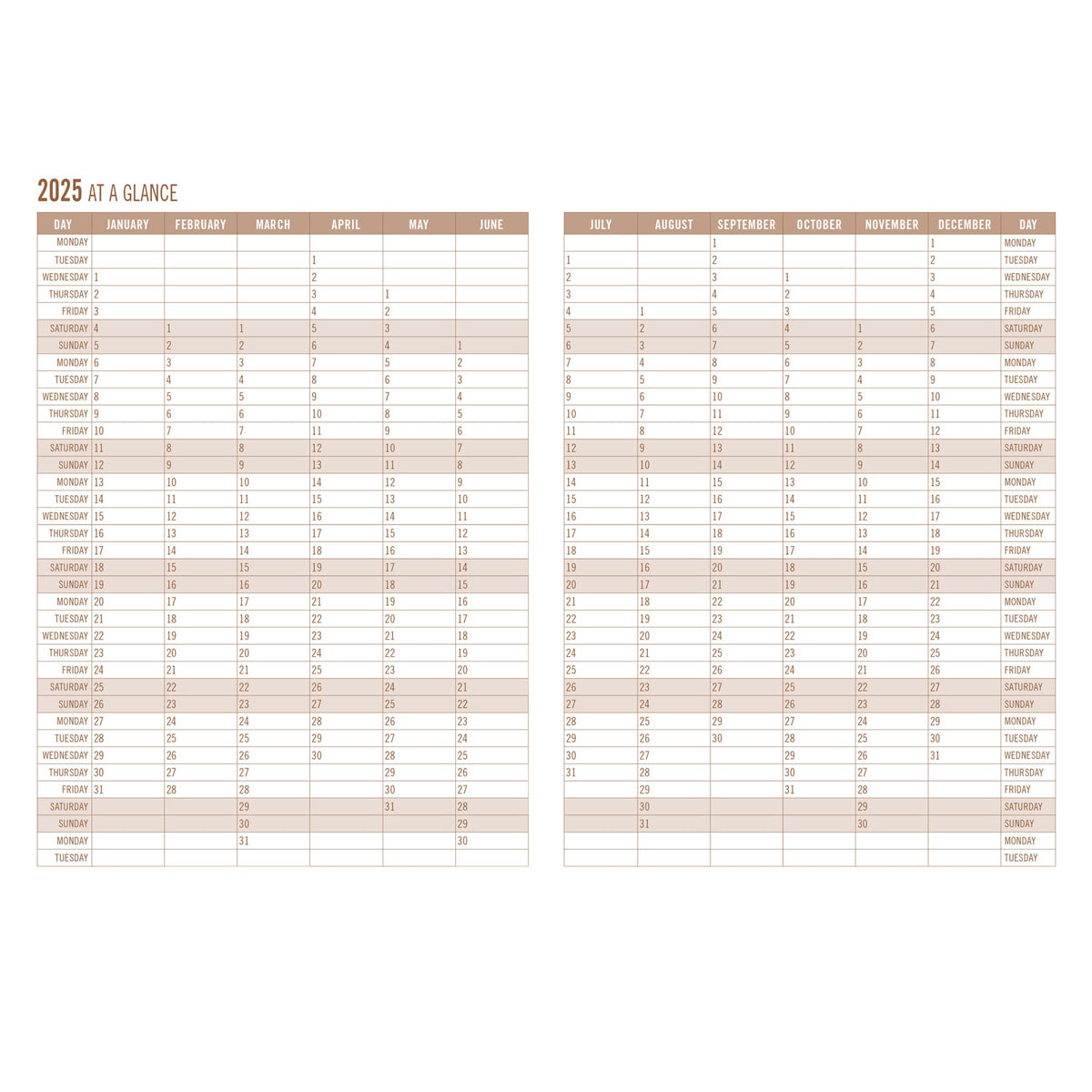 Month-at-a-glance spreads with room to mark key events, birthdays, and deadlines.