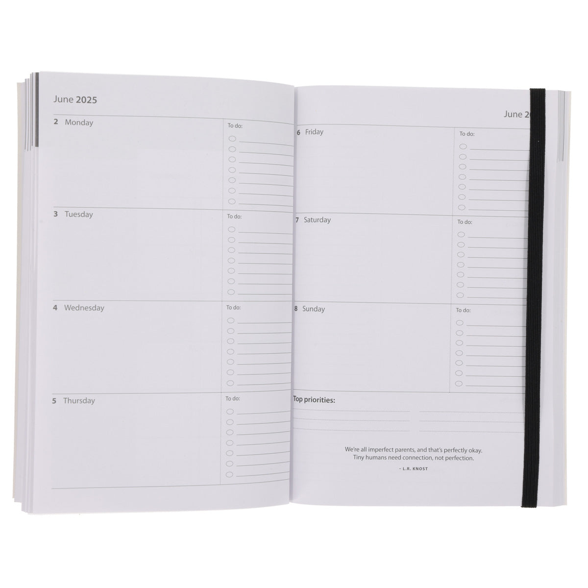 - Weekly Layout: View your entire week across a double-page spread, including sections for top priorities and to-do lists.
